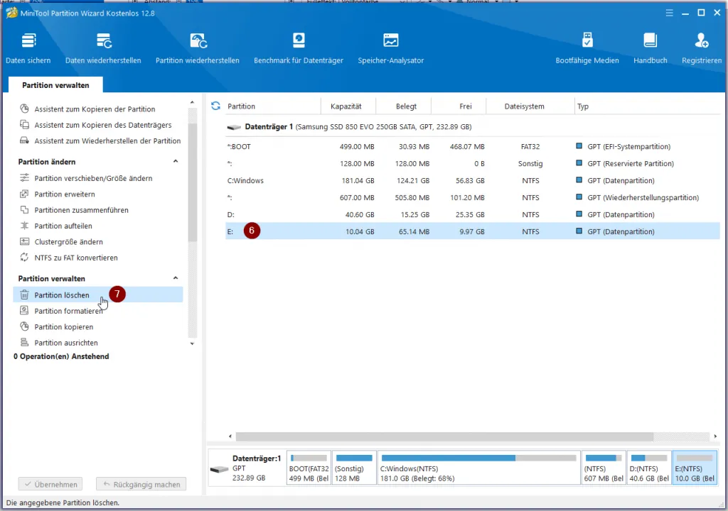 Das Löschen einer Partition ist mit wenigen Klicks erledigt. Du musst aus dem Dashboard die Partition wählen (6) und dann den Menüpunkt „Partition löschen“ (7) wählen.