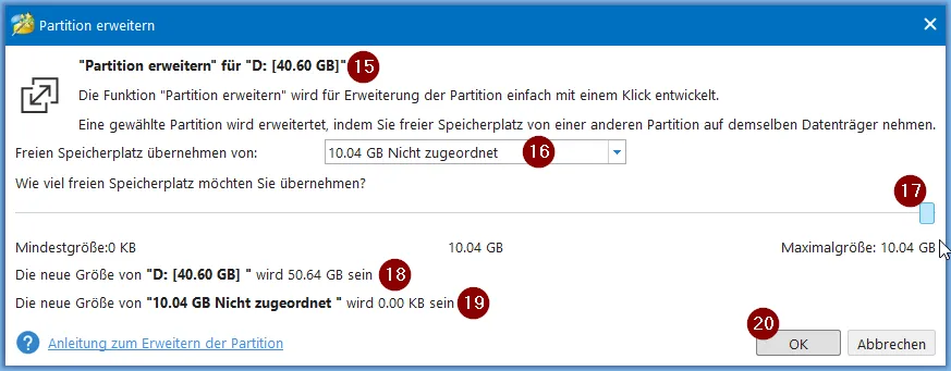 Im oberen fettgedruckten Text (15) sehen wir die ausgewählte Partition mit der aktuellen Größe. Aus der Auswahlliste (16) habe ich den nicht zugeordneten Speicherplatz ausgewählt und mit dem Schieberegler (17) aus das Maximum eingestellt.