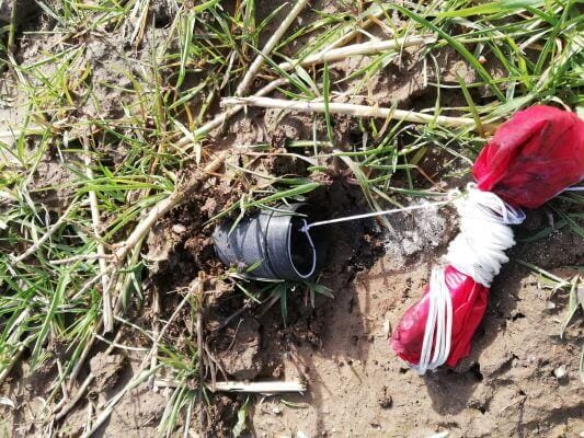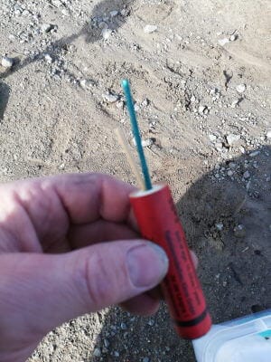Vor Ort habe ich zunächst den Zünder zusammengesetzt. Die Zündschnur wird mit einem Zahnstocher im Loch der Treibladung gesichert.