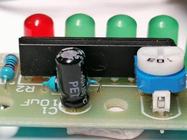Der verwendete IC in diesem Set ist einreihig und wird mit der Schrift zu den LEDs eingesetzt / eingelötet. Auf der Rückseite des ICs ist eine kleine, runde Vertiefung, welche ergo in Richtung des Drehpotentiometers zeigt.