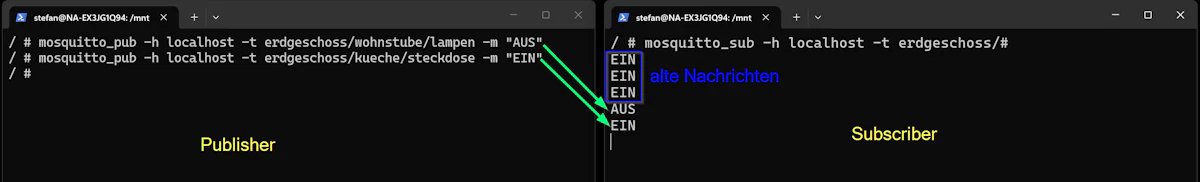 Der MQTT-Broker speichert dabei die letzte Nachricht pro Topic, wenn diese mit dem Retain-Flag (-r) gesendet wurde.