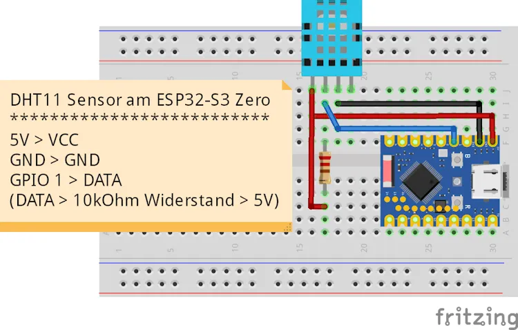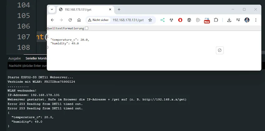 Nachdem die Schaltung steht, kümmern wir uns um den Code für den ESP32-S3 Zero. Der Mikrocontroller soll die Temperatur vom DHT11-Sensor auslesen, eine WLAN-Verbindung herstellen und die Messwerte als JSON-Antwort über einen kleinen Webserver bereitstellen.