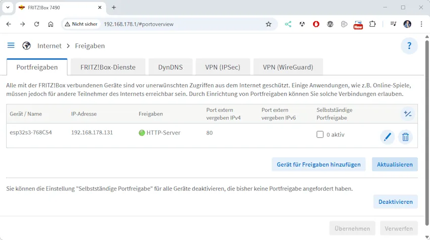Damit der ESP32 auch aus dem Internet erreichbar ist, musst du in deiner FritzBox eine Portfreigabe einrichten: