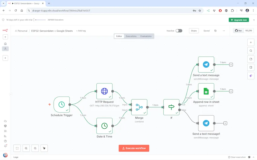 n8n – Workflow – Sensordaten vom ESP32 in Google Sheets speichern inkl. Telegram Message
