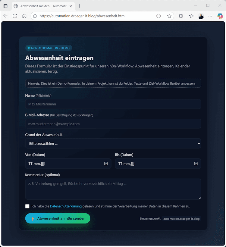 Damit der n8n-Workflow überhaupt Daten verarbeiten kann, brauchen wir zunächst ein kleines HTML-Formular. Dieses liegt später auf meiner Subdomain automation.draeger-it.blog und dient als Einstiegspunkt für alle Abwesenheitsmeldungen.