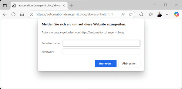 Um die Seite nicht komplett öffentlich zugänglich zu machen, habe ich die Subdomain zusätzlich mit einem einfachen Basic-Auth-Schutz versehen. Das ist sicherheitstechnisch keine Hochsicherheitslösung, aber für interne Tools und Demo-Formulare völlig ausreichend. So kann nicht jede zufällige Person auf das Formular zugreifen, aber ich komme trotzdem bequem von überall aus dran.