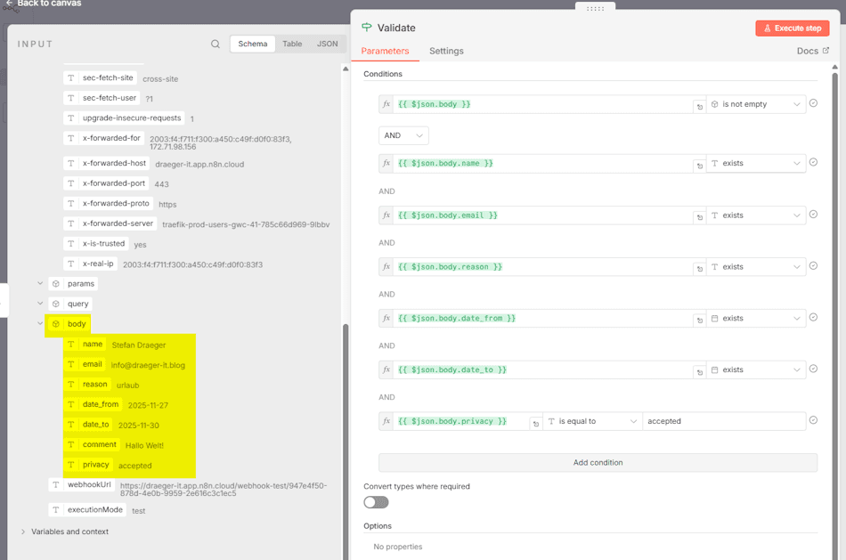 Theoretisch ließe sich das bereits im HTML-Formular mit etwas JavaScript abfangen – aber da wir hier bewusst einen Low-Code / No-Code-Ansatz verfolgen, erledigen wir diese Logik direkt in n8n.