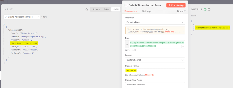 Beim Absenden wird das HTML-Formular direkt an n8n übermittelt. - Daten prüfen & formatieren