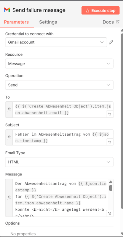 Im Fehlerfall – also wenn die Datumsprüfung fehlschlägt – senden wir wie erwähnt eine E-Mail an den Ersteller des Formulars. In dieser Nachricht erklären wir nicht nur, dass die Abwesenheit nicht gespeichert wurde, sondern geben auch einen kurzen Hinweis darauf, welche Prüfung nicht bestanden wurde. So weiß der Nutzer sofort, was zu korrigieren ist.