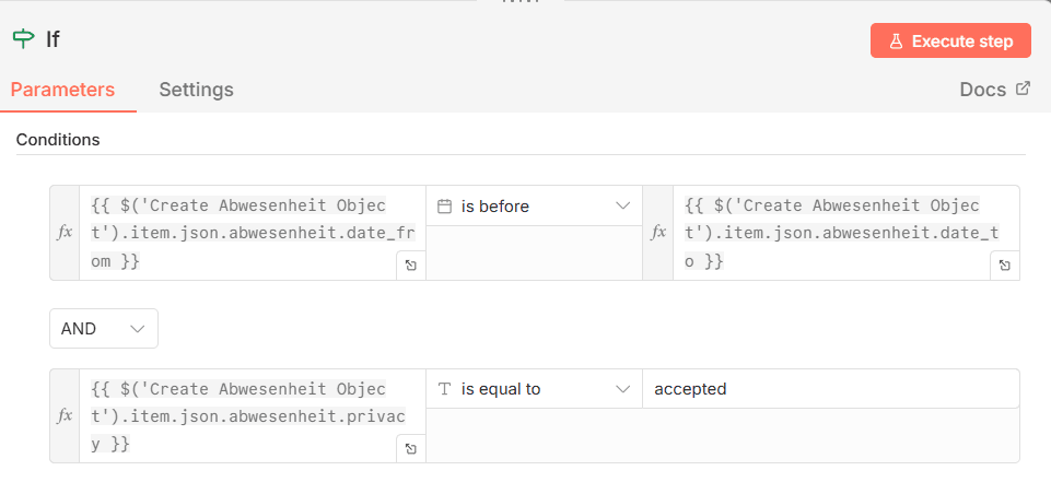 Dafür fügen wir eine IF-Node ein, die prüft, ob beide Datumswerte in der richtigen Reihenfolge liegen.