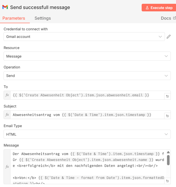 Der Abwesenheitsantrag vom {{ $('Date & Time').item.json.timestamp }} für {{ $('Create Abwesenheit Object').item.json.abwesenheit.name }} wurde <b>erfolgreich</b> mit den nachfolgenden Daten angelegt:<br/><br/>