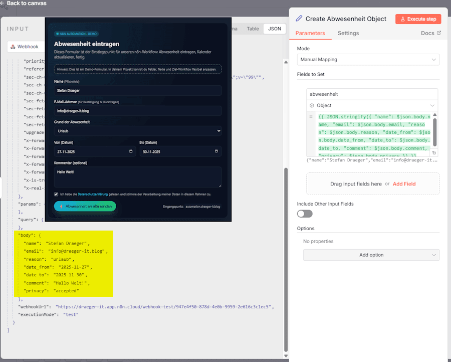 Sobald das Formular abgesendet wurde, landen die Daten im Webhook-Node unseres n8n-Workflows. Dort können wir sie bequem weiterverarbeiten und – für mehr Übersichtlichkeit – in ein sauberes JSON-Objekt umwandeln.