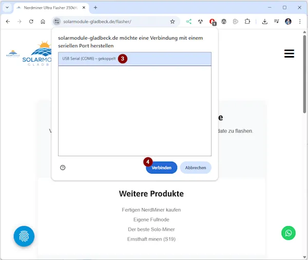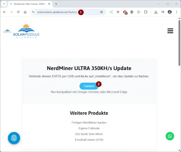 Schritt 1 – öffnen der Seite https://solarmodule-gladbeck.de/flasher/ und klicken auf „Connect“.