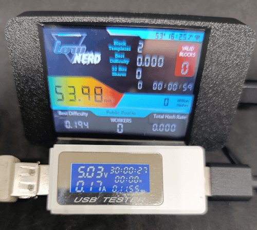 Ein NerdMiner vom Typ LILYGO Pico3 verbraucht ca. 0,39 Wh, der NerdMiner von LowNerd verbraucht 11,55 Wh.