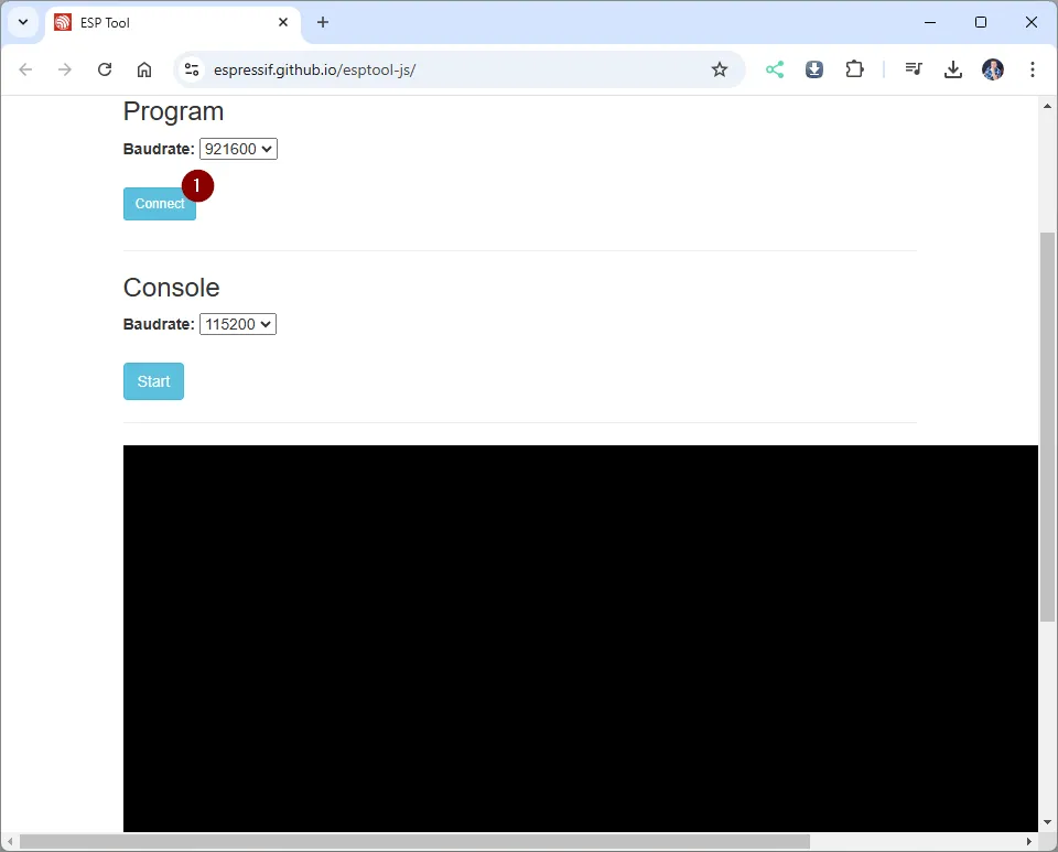 Wenn du diese Datei heruntergeladen hast, dann benötigst du jetzt entweder das esptool als Python Skript, EXE-Datei oder ganz bequem über ein Webfrontend unter https://espressif.github.io/esptool-js/. Hier benötigst du jedoch ebenso wie zuvor auch einen Chromium Browser!