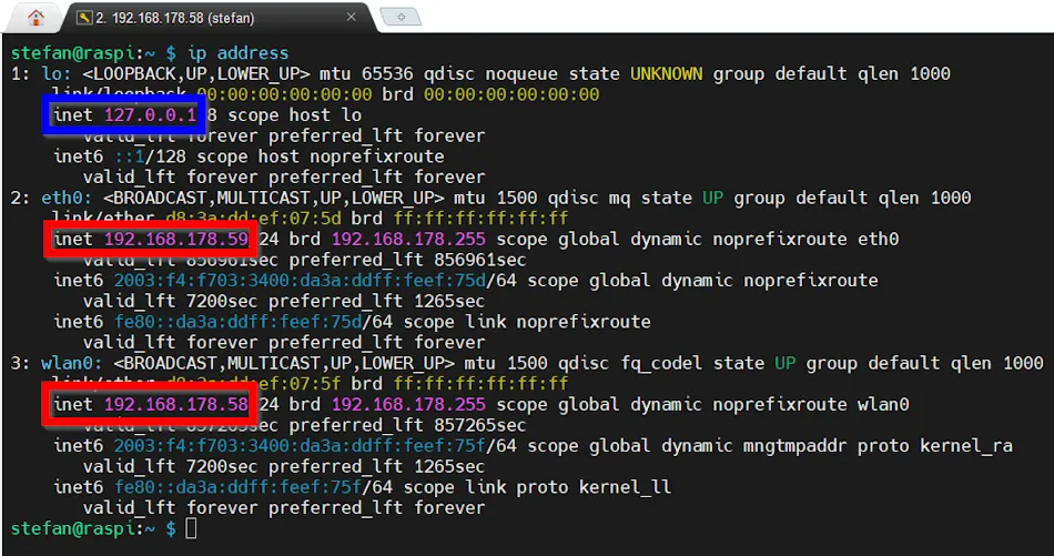 In diesem Fall ist mein Raspberry Pi mit WLAN & Netzwerkkabel verbunden. Daher erhalte ich zwei IP-Adresse (rot umrandet). Die blau umrandete IP-Adresse kannst du zbsp. verwenden wenn du lokal über den Desktop auf dem Raspberry Pi arbeitest (alternativ auch den Namen localhost).