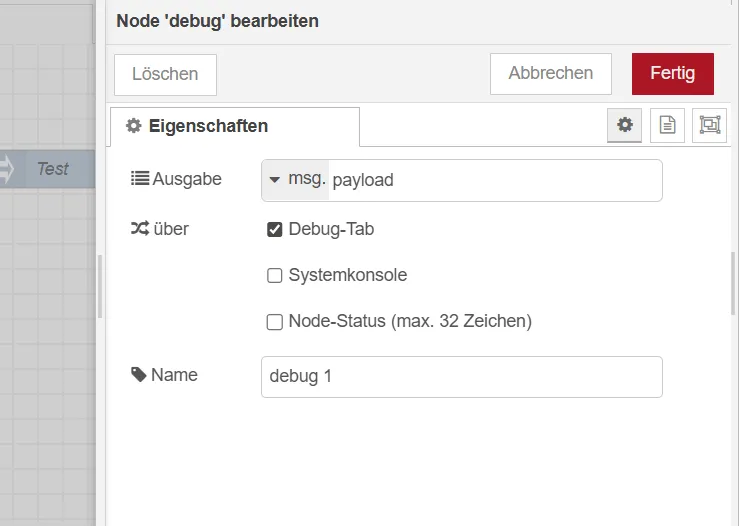 Die Debugnode müssen wir nicht weiter anpassen, jedoch kontrollieren das die Ausgabe in dem Debug Tab erscheint. Hier sollte der Haken per default gesetzt sein.