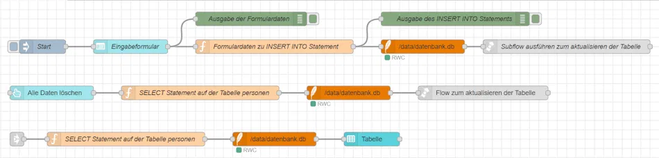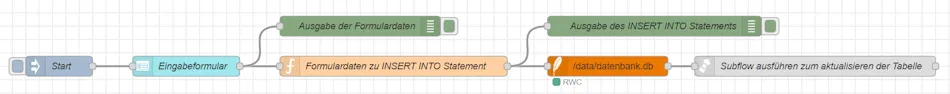 Der Flow zum Speichern der Daten in der Datenbank wird einmalig gestartet und stellt über das Dashboard ein Eingabeformular bereit. Die eingegebenen Daten werden anschließend in einer Function-Node zu einem INSERT INTO-Statement verarbeitet und danach in die Datenbank geschrieben.