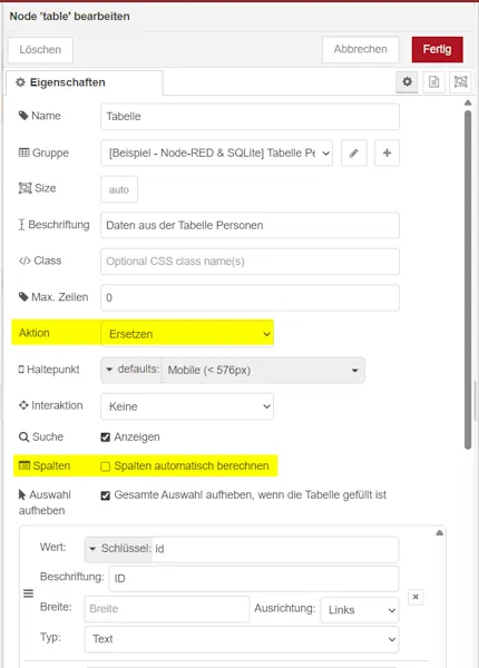 Daraus folgt jedoch das wir im unteren Bereich dann die Spalten manuell anlegen müssen. Hier können wir uns aus einer zuvor angelegten Debug Node der Felder bedienen welche wir anlegen müssen.