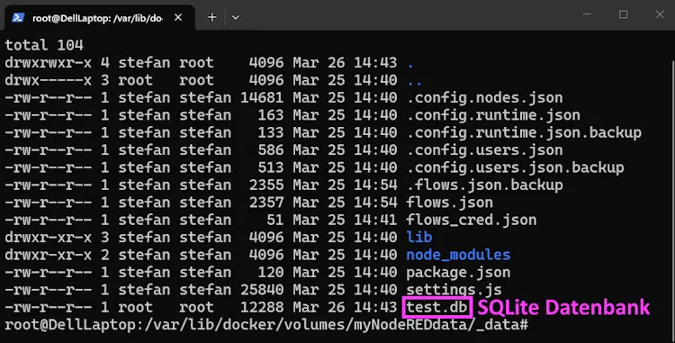 Da unser Node-RED Container ein Docker-Volume verwendet, liegt dieses auf dem Host-System im Verzeichnis: