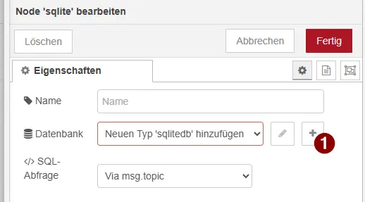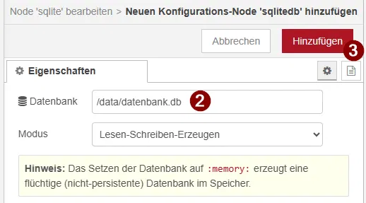 Damit die SQLite Node auf unsere Datenbank zugreifen kann, muss diese einmalig konfiguriert werden.
