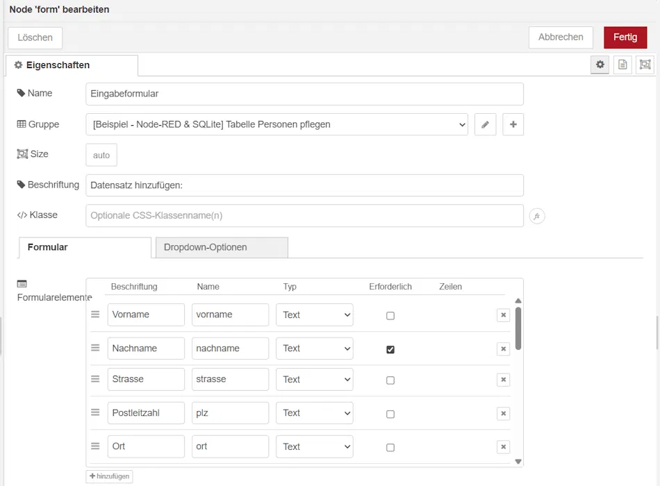 Das Eingabeformular lässt sich über die Form-Node recht einfach konfigurieren. Hier definieren wir die einzelnen Felder mit Namen, die beim Absenden an die Function-Node übergeben und dort weiterverarbeitet werden.