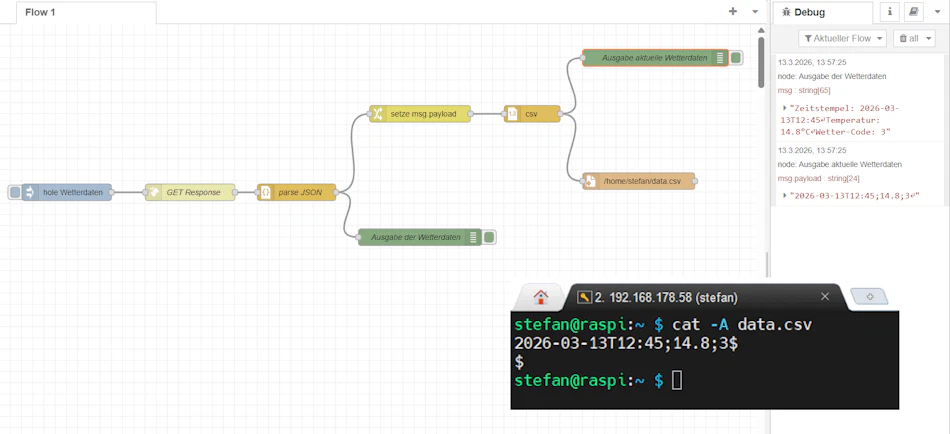 Auch das Speichern der Daten in einer Datei ist schnell realisiert, sobald man den grundlegenden Aufbau eines Flows verstanden hat. Mit der Kombination aus Change-, CSV- und File-Node können die Wetterdaten strukturiert abgelegt und später problemlos weiterverarbeitet werden.