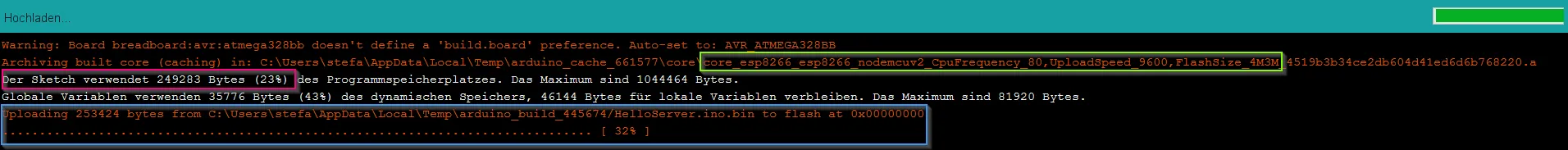 In der Grafik erkennt man die Konfiguration (grüner Kasten), wieviel Speicher der Sketch belegt (pinker Kasten) und den Fortschritt des Uploads (blauer Kasten).