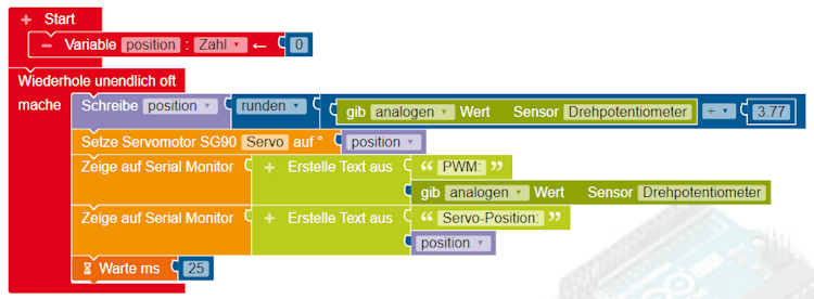 Den Wert des Drehpotentiometers lesen wir wieder aus und mappen diesen auf den Winkel.
