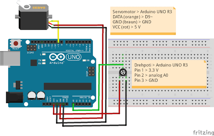 Wie du einen Servomotor am Arduino programmierst, habe ich dir bereits im Beitrag Arduino, Lektion 16: Servo ansteuern gezeigt. Zusätzlich möchte ich noch einen Drehpotentiometer einbauen, um den Winkel über diesen zu setzen.
