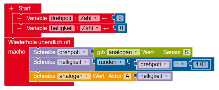 Der Drehpotentiometer wird wie erwähnt an einen analogen Pin angeschlossen und liefert Werte zwischen 0..1023. Wie du diese Werte nun auf ein PWM Signal mappen kannst, habe ich dir bereits im Beitrag Open Roberta Lab – analoges Signal auf PWM mappen erläutert.