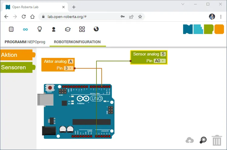 Zunächst müssen wir in dem Reiter „ROBOTERKONFIGURATION“ die erzeugte Schaltung nachbauen.