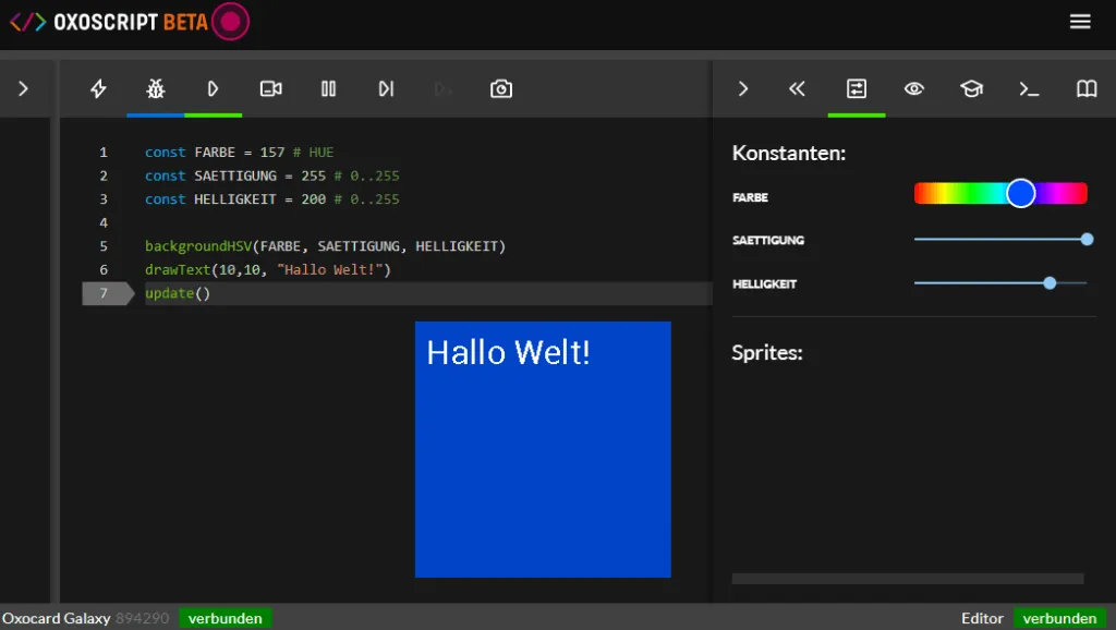 const FARBE = 157 # HUE const SAETTIGUNG = 255 # 0..255 const HELLIGKEIT = 200 # 0..255 backgroundHSV(FARBE, SAETTIGUNG, HELLIGKEIT) drawText(10,10, "Hallo Welt!") update()
