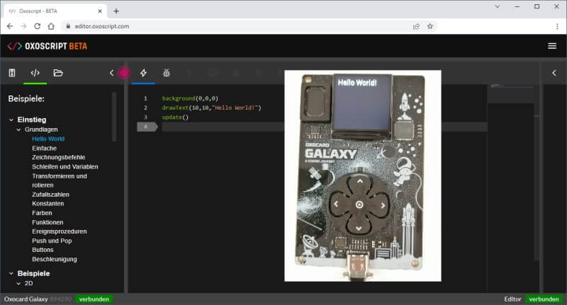 Zum Programmieren dieses Mikrocontrollers gibt es den Online-Editor OxoScript (derzeit in der BETA Version) zum professionellen Programmieren in Python.