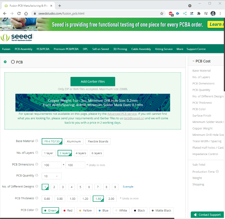 Für das Erstellen einer Platine wird ein Gerber File benötigt. Diese Datei kann aus so ziemlich jedem Layout Designer erstellt werden. In meinem Fall war es aus EasyEDA mit zwei Klicks erstellt.