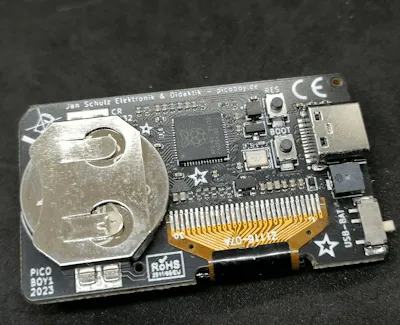 Der PicoBoy verfügt auf der Vorderseite über ein 1,3″ OLED-Display und drei verschiedenfarbige SMD LEDs. Auf der Rückseite findest du den Adapter für die Knopfzelle sowie einen Schalter für den Wechsel von USB auf Batterie, eine USB-C-Schnittstelle und eine Taste für Reset und Boot.