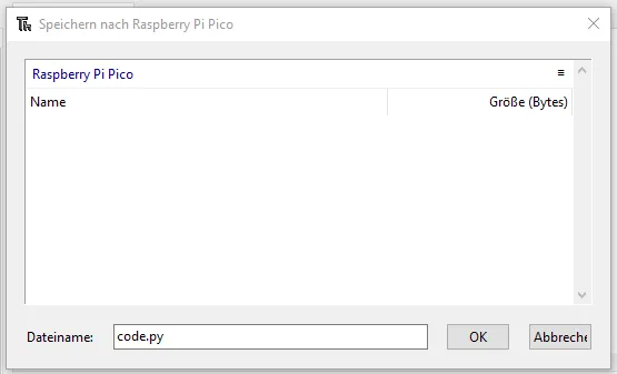 Im neuen Dialog geben wir dann den gewünschten Dateinamen „code.py“ ein und bestätigen dieses mit der Schaltfläche „OK“.