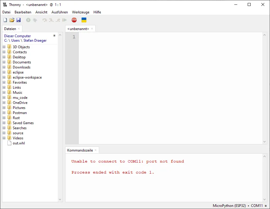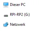 Damit wir dieses jedoch machen können, müssen wir zunächst die Taste „BOOT“ festhalten und dann das USB-Kabel mit dem PC verbinden. Es sollte dann ein Laufwerk im Explorer sichtbar werden, auf welchen wir dann unsere UF2-Datei mit der Firmware für Micropython kopieren können.