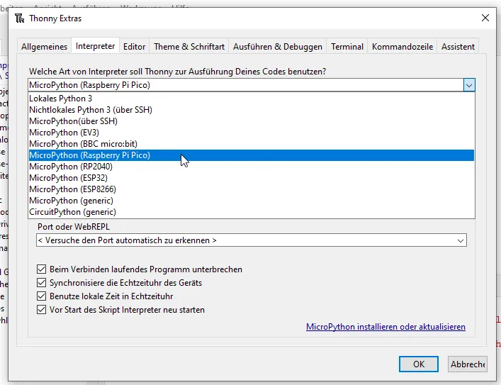 Danach musst du die Art des Interpreters wählen, in meinem Fall habe ich den PicoBoy für Micropython geflasht und muss hier den Eintrag „MicroPython (Raspberry Pi Pico)“ auswählen.