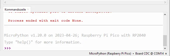 Wenn nun der Mikrocontroller korrekt erkannt wurde, sollte in dem Reiter „Kommandozeile“ die nachfolgende (graue) Ausgabe erfolgen. Ggf. musst du in der Toolbar ein bis zweimal auf das Stop Symbol klicken.