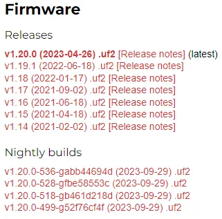 Die UF2-Datei für den RP2040 bekommst du für einen Raspberry Pi Pico, mit und ohne WiFi / Bluetooth Support. In unserem Fall benötigen wir diese ohne die drahtlosen Schnittstellen. Unter https://micropython.org/download/RPI_PICO/ findest du eine Liste mit verfügbaren Firmwaredateien.