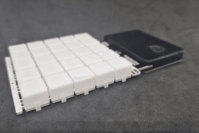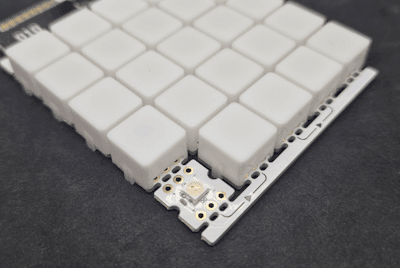 Zum Lieferumfang der Pixelmatrix Combo gehört neben der Platine mit den 25 RGB NeoPixel welche seriell verbunden sind noch ebenso 25 Kappen, welche als Diffusor dienen, denn diese NeoPixel können sehr hell und grell sein. Die Helligkeit der NeoPixel LEDs lässt sich auch im Code manipulieren.