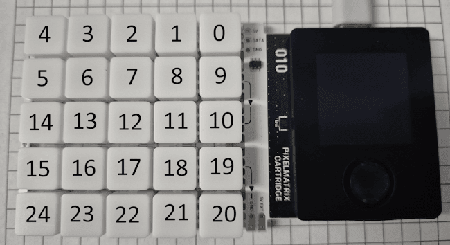 Die NeoPixel auf der Pixelmatrix sind wie im folgenden Bild angeordnet. Du beginnst oben rechts mit dem Index 0 und endest unten links mit dem Index 24. Wichtig zu beachten ist, dass die NeoPixel zeilenweise nummeriert sind. Das bedeutet, nach dem letzten Pixel einer Zeile wird der Index in der nächsten Zeile an derselben Seite fortgeführt – es wird also nicht umlaufend nummeriert.