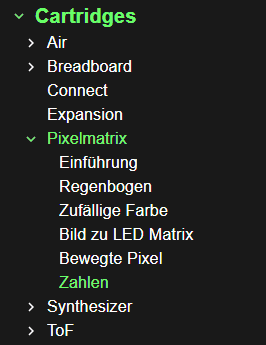 Du findest im NanoPy Editor viele Beispiele zu den vorhandenen Cartridges, unter anderem auch für die Pixelmatrix. Eines der Beispiele ist die Darstellung von Zahlen (siehe Screenshot rechts).
