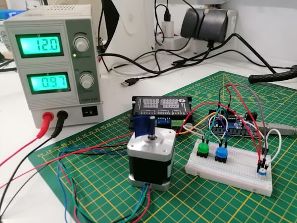 Der Code bewirkt das, wenn wir den grünen Taster betätigen, der Schrittmotor nach rechts dreht und beim blauen Taster der Schrittmotor nach links dreht. Über den Drehpotentiometer kann man die Geschwindigkeit des Motors einstellen (diese erkennt man, wenn man den Taster gedrückt hält).