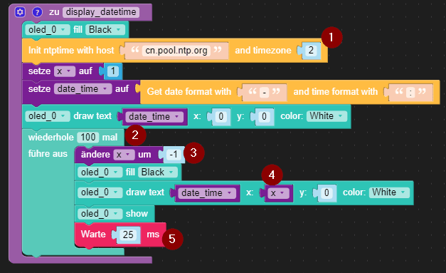 In der Funktion „display_datetime“ wird zunächst die Verbindung mit dem NTP Server „cn.pool.ntp.org“ aufgebaut (1). Alternativ kann man auch den deutschen NTP Server unter „de.pool.ntp.org“ verwenden. Jedoch wird jeweils als Timezone der Wert „2“ gesetzt das bedeutet die „Greenwich Mean Time“ +2 Stunden.