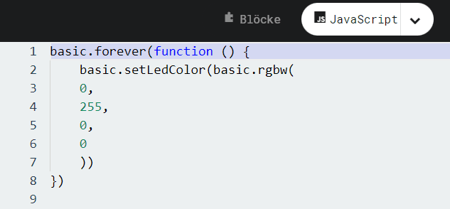 In der Software MAKECODE kann man auch in JavaScript programmieren. Dazu muss man lediglich im oberen Bereich von