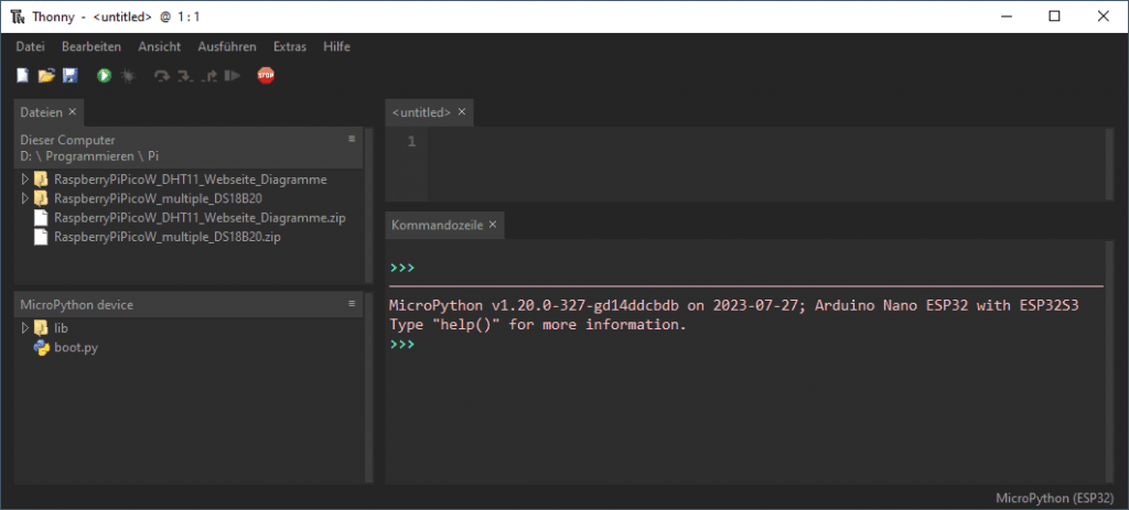 Wenn du deinen Nano ESP32 mit dem MicroPython Installer geflasht hast, dann kannst du ebenso auch die Thonny IDE verwenden. Dieses Tool kannst du dir unter https://thonny.org/ ebenso für Microsoft Windows, Linux & macOS herunterladen.