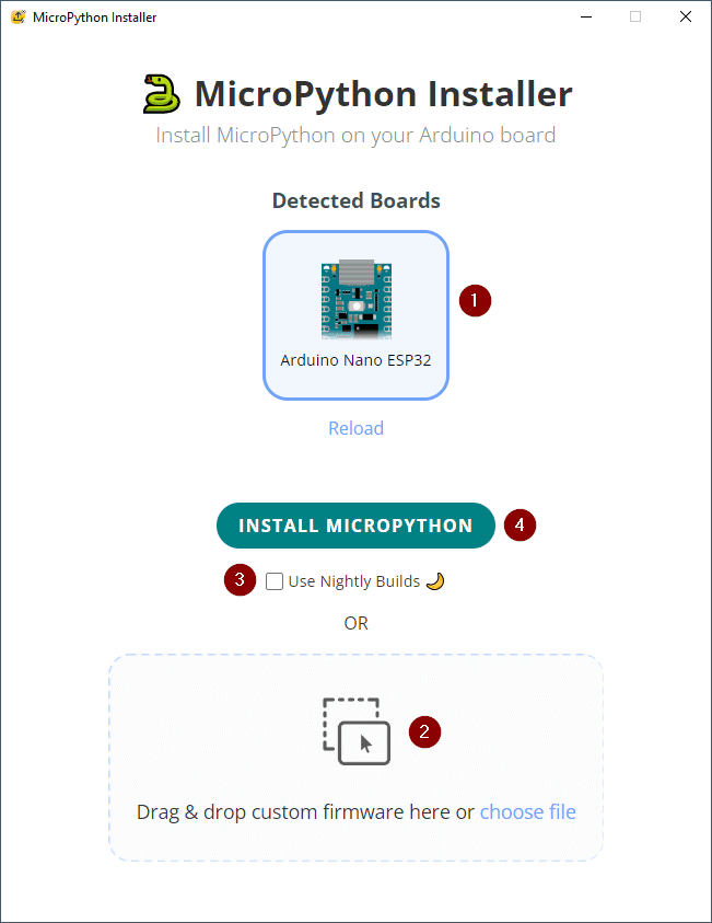 Im MicroPython Installer siehst du dein Board (1) sowie eine Fläche (2), um per Drag’n Drop ein benutzerdefiniertes Flash File hochzuladen. Wir können jedoch auf das Repository zugreifen und über die Schaltfläche „INSTALL MICROPYTHON“ (4) klicken.
