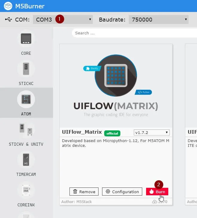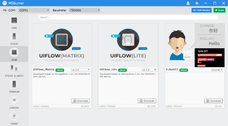 Da wir wie bereits erwähnt einen ATOM Matrix haben, klicken wir die Schaltfläche „Download“ in der Kachel „UIFLOW(MATRIX)“.